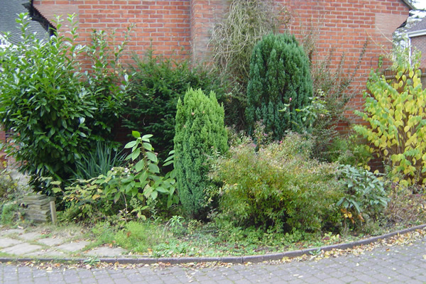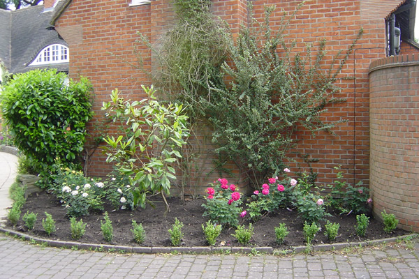 Here is an example of 3 areas in the front & rear gardens of a house in Cobham. The clients wanted to replace existing overgrown conifers and shrubs with a selection of roses. We designed the layout with the help of a specialist rose nursery to create the desired effect. We worked with our landscape partner to completely makeover the front and rear gardens of this large property. First was the clearance of all old plants and tree stumps and clearing the old overgrown compost area. The areas where the trees stumps and compost were removed were seeded to extend the lawn. We dug out the borders of the walled garden many time to remove the infestation of weeds and prepare the soil for planting. We planted in total 133 plants, shrubs and roses with specialists composts, fertilised the lawns and created a new hidden compost area under the canopy of large trees. We used specialist nurseries to hand select the plants, shrubs and roses. Before & After Please click on the photos for a larger image.