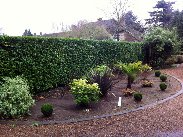 Hedge Cutting & Trimming Cobham & Surrounding Surrey Areas We specialise in planting and creating instant laurel hedging as shown in the first picture which was taken in a Cobham garden on the day that it was planted. We pride ourselves on maintaining and shaping hedges to make them look neat and tidy all year round. This second picture shows a laurel hedge in Cobham in November trimmed and looking good. We look after hedges not only in Prunus (Laurel) but in Taxus (Yew), Fagus (Beech), Carpinus (Hawthorne) Ligustrum (Privet) Buxus (Box) and Cupressocyparis (Leylandii). Give us a call or drop us an email and we’ll be delighted to come round and give you an instant quote. Click the photos for an enlargement |